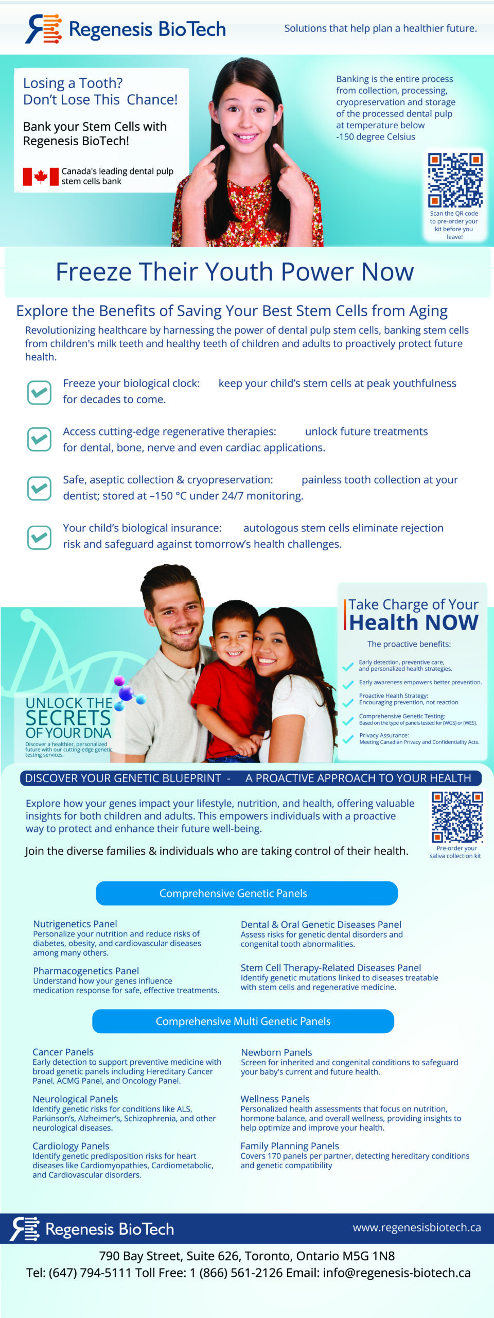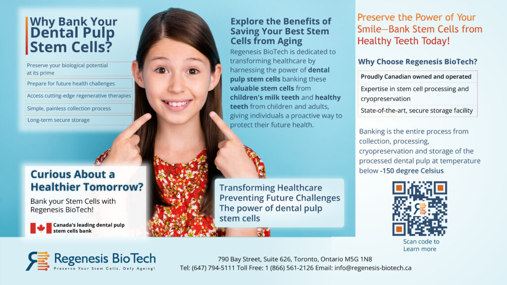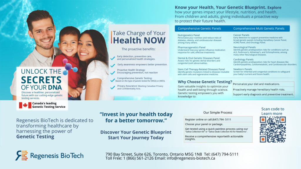 Regenesis Biotech is a Canadian health innovation company specializing in preventive and regenerative medicine. Based in Toronto, they offer advanced genetic testing and dental stem cell banking services designed to help individuals take proactive control of their long-term health. With over 15 years of scientific expertise, Regenesis provides secure, affordable solutions that empower families to detect potential health risks early and preserve stem cells for future therapeutic useāall backed by local laboratory operations and expert support.